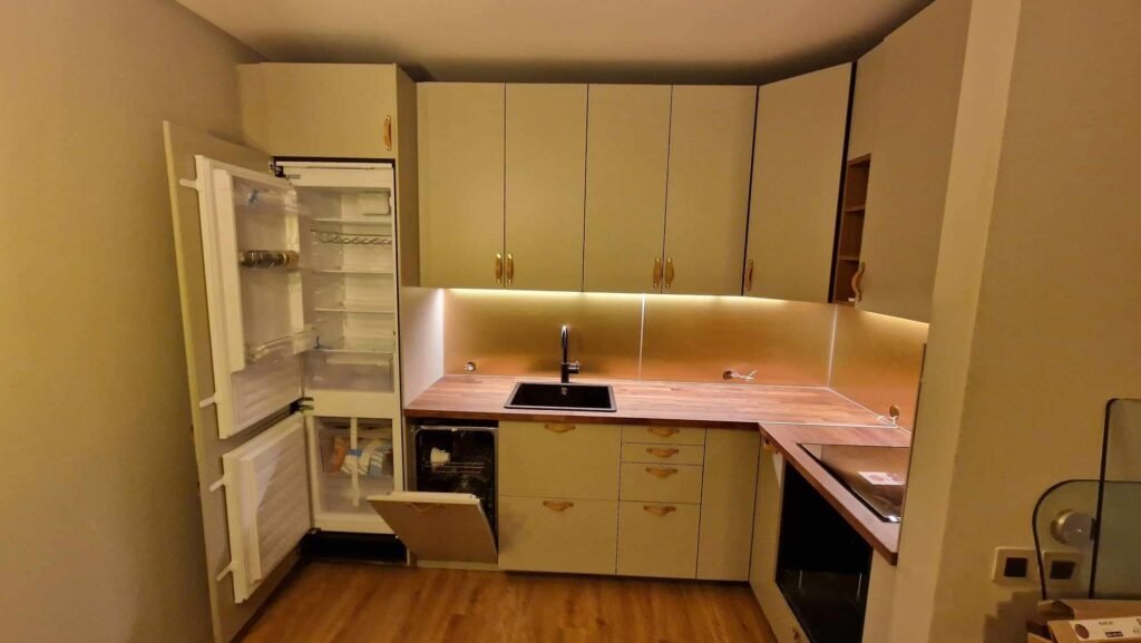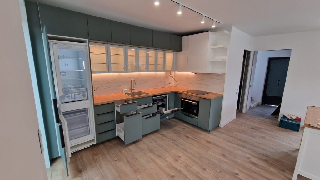 Професионален монтаж на кухни по проект – шкафове, плотове, вградени уреди и механизми. Гарантираме точност, правилно нивелиране и функционалност, съобразени с вашето пространство и нужди.